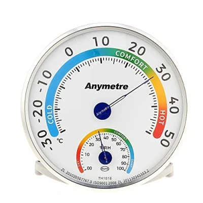 TEMPERATURE AND HUMIDITY METER: 2in1 design, super large LCD monitor shows instant and current temperature and humidity. Extra comfort meter ensures a comfortable environment for your family. SENSITIVE & ACCURACY: Temperature measurement range from -30℃ to +50℃, accuracy is within ±1℃. Humidity measurement range from 0% up to 100%, accuracy is within ±5%. Temperature and Humidity comfort color indicates indoor air condition - DRY/COMFORT/WET, get the accurate reading directly with the analog display. WIDE APPLICATION: Perfect for monitoring temperature and humidity, show in degrees Celsius, the Thermo-hygrometer suits for using indoor, like home, office, greenhouse, living room, perfect for baby children room. When using outdoor, pls do not exceed the temperature range -30℃~50℃. COMPACT & STAND DESIGN: The analog hygrometer thermometer is suitable for hanging or placing on a surface, it can stand on the desk easily and steady with the stand foot. With the Back Hanging Hole, you can hang it on the wall easily as well. HIGH QUALITY: Steel stainless and clear exquisite dial/Gauge with easy to read scale, no battery required, no operation require.