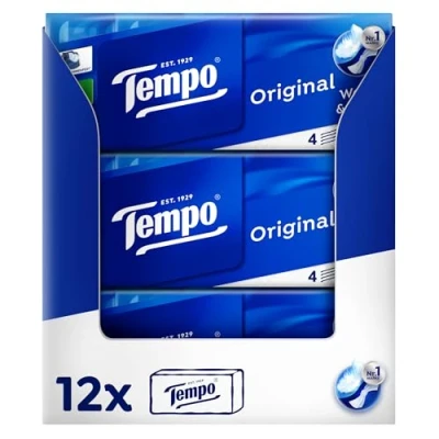 The original from Tempo – extra strong and uniquely soft: the handkerchief with four layers offers the unique combination of softness and strength Tempo Original tissues are also available as an alternative: decorative and practical - the design boxes made of paper are ideal for home use Machine washable paper - leaves no white lint or scraps of paper: so strong that the tissues can withstand an accidental wash cycle in the washing machine Box contents: 1 x Megapack Tempo Classic handkerchiefs with 12 packs (with 10 packs of 10 tissues) - with practical comfort opening, white, 4-ply, dermatologically tested For over 90 years, the brand for reliable hygiene items of high quality for home and travel. The traditional brand for hygiene items for home and on the go brings high-quality toilet paper to the market in addition to the paper towels for hygiene and health. At the same time, Tempo stands for quality you can rely on. All products combine one: the unbeatable combination of strength and softness