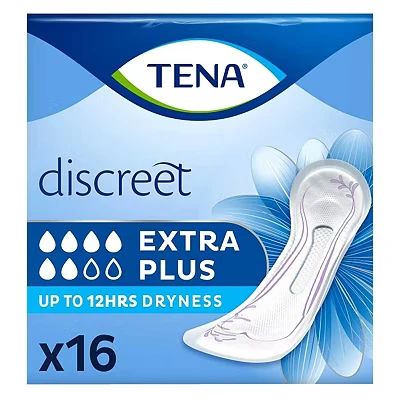 TENA Discreet Extra Plus incontinence pads offer triple protection against leaks, odours, and moisture for women with moderate incontinence. With InstaDRY‚Ñ¢ technology, a close body fit, and fresh odour control, they ensure comfort, security, and confidence all day.