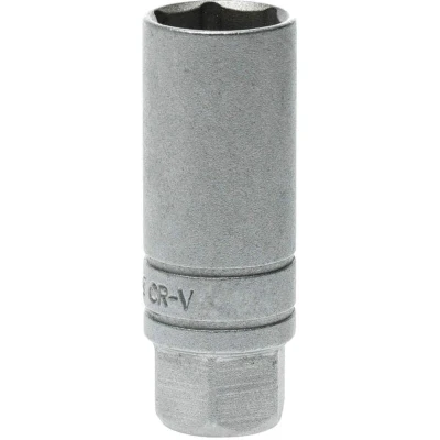 General description This 3/8" spark plug socket wrench is designed for efficient removal and installation of spark plugs. It features a 16mm size and a length of 64mm, constructed from durable chrome vanadium steel with a matte finish for enhanced durability and a professional appearance. The socket includes a rubber insert for improved grip and handling. Technical specifications Drive Size: 3/8in Length: 64mm Size: 16mm Material: Chrome vanadium steel Finish: Matte External Hexagon Size: 24mm Compatibility and accessories Compatible with standard 3/8" drive tools Suitable for spark plugs with a 16mm hex size Installation Attach the socket to a compatible 3/8" ratchet or wrench Ensure the socket fits securely onto the spark plug Usage Use to remove or install spark plugs in automotive or machinery applications Apply force with a wrench or ratchet for tightening or loosening Other information