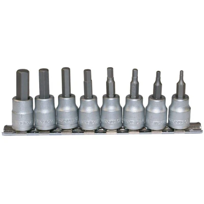 General description This Teng Tools 8-piece set consists of 3/8 inch drive AF hex bit sockets made from durable chrome vanadium steel with a satin finish. The sockets are designed for strength and longevity, suitable for various DIY and home improvement tasks. They are supplied on a clip rail for easy organization, wall mounting, or use in a toolbox. Technical specifications Number of pieces: 8 Drive size: 3/8 inch Material: Chrome vanadium steel Finish: Satin Socket sizes: 3/32 in, 1/8 in, 5/32 in, 3/16 in, 7/32 in, 1/4 in, 5/16 in, 3/8 in Compatibility and accessories Compatible with 3/8-inch drive tools Includes a clip rail for organization and storage Installation Simply attach the sockets to compatible 3/8-inch drive ratchets or wrenches for use. Usage Ideal for tightening or loosening hex fasteners in various DIY projects and home repairs. Other information