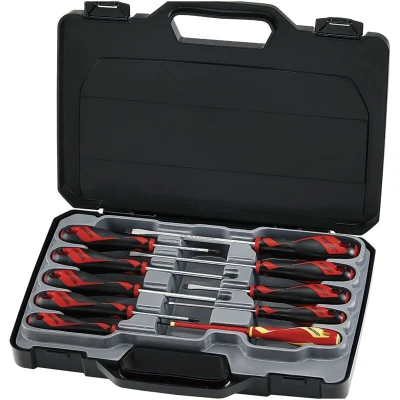General description The Teng Tools MD910N 10 Piece Screwdriver Set is supplied in a durable plastic case. This set features ergonomically designed two-component handles for comfort and includes a hanging hole for easy storage. Technical specifications Number of Pieces: 10 Type: Slotted (Sl), Phillips (Ph), Pozidriv (Pz) Slotted Screwdrivers: 3.0 x 100mm, 5.5 x 75mm, 5.5 x 150mm, 6.5 x 150mm Insulated Screwdriver: 3.0 x 100mm Phillips Screwdrivers: PH0 x 75mm, PH1 x 75mm, PH2 x 100mm Pozidriv Screwdrivers: PZ1 x 75mm, PZ2 x 100mm MPN: MD910N EAN: 5020385063464 Other information