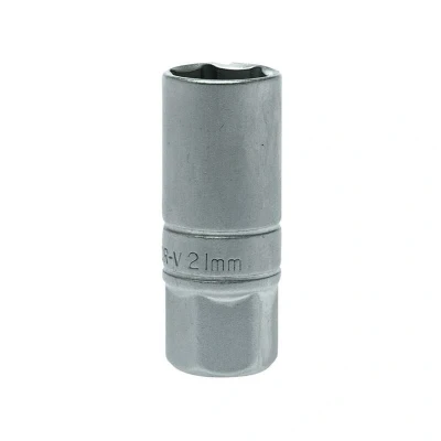 General description This 1/2 inch drive, 6-point spark plug socket is designed for easy and secure removal or installation of spark plugs. Made from durable chrome vanadium steel, it features a satin finish for corrosion resistance and a rubber insert to prevent damage to spark plugs. Technical specifications Drive size: 1/2 inch Socket size: 21mm Number of points: 6-point Material: Chrome vanadium steel Finish: Satin Length: 70mm Compatibility and accessories Compatible with standard 21mm spark plugs Designed for use with 1/2 inch drive ratchets or wrenches Installation Attach the socket to a compatible 1/2 inch drive ratchet or wrench Ensure the socket is securely fitted onto the spark plug Usage Use to remove or install spark plugs in automotive or machinery engines Apply appropriate torque to avoid damage Other information