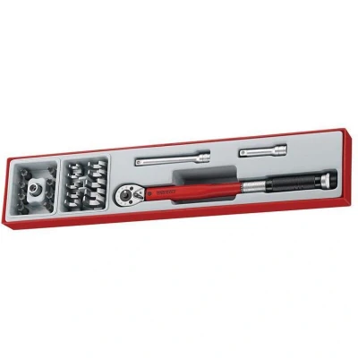 General description The Teng TTX3892 3/8in Drive Torque Wrench Set is a comprehensive 22-piece toolkit designed for precision and convenience. It comes in a unique Teng Tools TC tray, which can be utilized independently or integrated into the Teng Tools TC control system. The tray features a removable hinged click lock lid and dove tail joints, allowing for easy stacking and compatibility with Teng Tools toolboxes and roller cabinets. Each tool has its designated place, ensuring easy identification and organization. Technical specifications Torque Wrench: 3/8in Drive, 20-100Nm TORX Bits: 8 x 10mm Hex Drive (TX8, TX10, TX15, TX20, TX25, TX27, TX30, TX40) Crow Foot Wrenches: 10 x 3/8in Drive (10, 11, 12, 13, 14, 15, 16, 17, 18, 19mm) Extensions: 2 x 3/8in Drive (3in, 5in) Adaptor for 10mm Hex Bits: 1