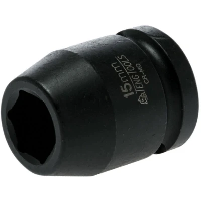 General description This Teng Impact Socket is a hexagonal 6-point socket made from high-quality chrome-molybdenum steel, designed for use with power tools and air tools. It features a secure locking hole for safety pins, ensuring a firm attachment to the square drive of the tool. This socket is built for durability and reliability, making it suitable for both industrial and automotive applications. Technical specifications Material: Chrome-molybdenum steel Size: 15mm Length: 38mm Outer diameter D1: 23.0 mm Outer diameter D2: 30.0 mm Drive: 1/2 inch Compatibility and accessories Compatible with impact wrenches and power tools that accept ½ inch drive sockets Includes a safety pin hole for secure attachment Installation Attach the socket to a compatible ½ inch drive impact wrench or ratchet Ensure the safety pin is properly inserted through the hole for secure fitting Usage Use for tightening or loosening hexagonal bolts and nuts Suitable for heavy-duty applications requiring impact