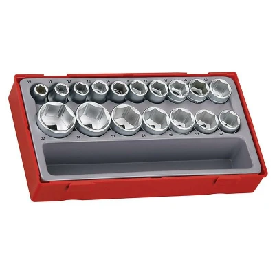 TENG TOOLS 17-piece metric socket set with regular 6-point 1/2in drive sockets manufactured from chrome vanadium steel with a satin finish. The set includes 17 sockets in sizes 10, 11, 12, 13, 14, 15, 16, 17, 18, 19, 20, 21, 22, 24, 27, 30 and 32 mm, supplied in a compact storage tray for neat organization. Tray dimensions are 265 x 142 x 50 mm and the set weighs 1.8 kg. Includes 17 regular 6-point metric sockets sized 10, 11, 12, 13, 14, 15, 16, 17, 18, 19, 20, 21, 22, 24, 27, 30 and 32 mm. 1/2in drive for heavy-duty torque and secure fastener engagement. Made from chrome vanadium steel for strength and long-lasting durability. Satin finish for corrosion resistance and reduced glare. Supplied in a molded storage tray for tidy storage and easy socket selection. Compact dimensions 265 x 142 x 50 mm and total weight 1.8 kg for convenient handling. Metric measurement standard covering common workshop sizes.