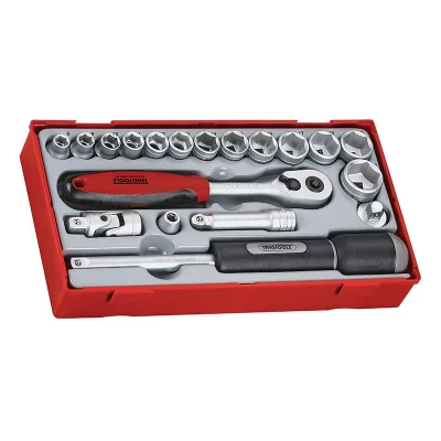 General description The Teng Tools TT3819 Regular Metric Socket Set is a comprehensive 19-piece collection designed for efficiency and durability. This set includes a variety of sockets and accessories, all crafted from high-quality chrome vanadium steel, ensuring excellent torque while minimizing the risk of rounding fasteners. The set is conveniently supplied in a storage tray for easy organization. Technical specifications Dimensions: 265 x 142 x 50 mm Weight: 1.0 kg Contents 13 x Regular 6-Point Sockets: 8, 9, 10, 11, 12, 13, 14, 15, 16, 17, 18, 19, and 22 mm 1 x 3/8in Drive Pro Ratchet 1 x 3/8in Drive Universal Joint 1 x 3/8in Drive Wobble Extension (3 in) 1 x 3/8in Drive Rotating Spinner Handle (10 in) 1 x 3/8in Drive 1/2in F - 3/8in M T-Bar Adaptor 1 x 3/8in Drive Coupler Adaptor