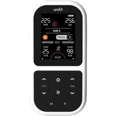 ADVANCED ELECTROTHERAPY: Unifit combines multiple technologies: TENS, EMS and massage, to give you greater control and more options. Ranging from pain relief to muscle strengthening and rehabilitation and muscle relaxation. Delivering effective assistance to what ever you may need SPECIALLY DESIGNED INTERFACE: A screen designed for convenience and ease which shows you all the details of your usage. Meaning you have complete control and understanding of the programme, intensity and time left in one convenient spot MUSCLE SPECIFIC: The Unifit has been designed with programmes, tailor made for different muscle groups. Giving you a more effective work out or recovery for the muscles you are focusing on COMFORTABLE STIMULATION: The Unifit increases in 1mA steps, allowing you to find a comfortable level of stimulation that works best for your needs and programme you are using. Giving you more effective use of the device DUAL CHANNEL: The Unifit allows for 4 electrodes in total, via two channels, with different intensities. To allow you to focus on large muscle groups, such as: abs and backs: or smaller muscles groups, such as: both sets of arms. Allowing you to work on any muscle you need