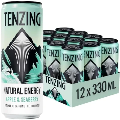 TENZING Natural Energy Drink, Plant Based, Vegan, & Gluten Free, +BCAA, Apple Seaberry, 330ml (Pack of 12) Packaging may vary