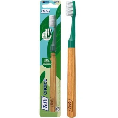 TePe Choice Toothbrush, Soft, Green, 1pc, Wooden Handle, 3pcs Brush Heads, Soft Bristle Good for Teeth Cleaning and Plaque Removal