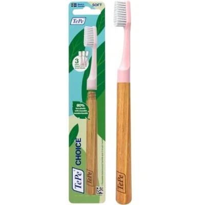 TePe Choice Toothbrush, Soft, Pink, 1pc Wooden Handle, 3pcs Brush Heads, Soft Bristle Good for Teeth Cleaning and Plaque Removal
