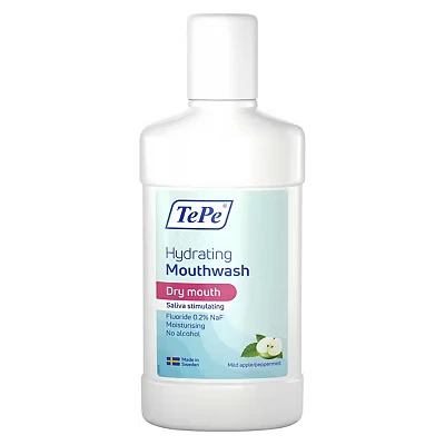 Eases dry mouth discomfort: A hydrating mouthwash for people who need comfort for dry mouth. Suitable for people who experience mild discomfort. With its viscous consistency, the mouthwash is gentle and will help moisturise the mouth. Long-lasting comfort: The long-lasting effect will give comfort for a long period. How long the comforting effect lasts depends on how severe your discomfort is. Suitable for people who suffer from dry mouth, such as having sticky saliva. Apple and mild peppermint: The flavour of the TePe Hydrating Mouthwash for Dry mouth is apple and mild peppermint. The mouthwash will leave you with a fresh and clean feeling. Suitable for people who aren’t sensitive to added flavours. Saliva stimulating ingredients: With its saliva stimulating effect it will help people who experience dry mouth to ease their discomfort. Free from alcohol which will create a gentle user experience. Use 1-2 times per day with its practical dosing cup. Fluoride mouthwash: Dry mouth can lead to an increased risk for cavities. This mouthwash contains 0.2% fluoride which will work as an extra protection against caries. Use from 12 years.