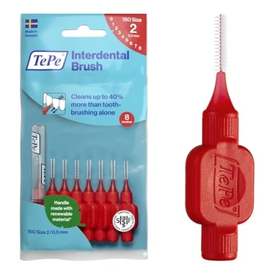 Interdental cleaning: TePe Original Interdental brush is a plaque remover that allows you to safely clean between your teeth. It is also a great oral care tool for cleaning implants, crowns and bridges. Suitable for narrow gaps. Dental plaque removal tool: The Interdental Brush from TePe helps you remove plaque and clean the remaining 40% of your teeth that a toothbrush doesn't reach. An efficient and easy way to remove plaque between teeth. For a fresher breath: It's important to have a good oral hygiene. Use daily for healthier teeth and gum and for a fresher breath. Use together with a toothbrush in your daily oral care routine. Renewable materials: The materials of the TePe Interdental Brush are sourced from renewable materials, with a great focus on product quality, efficiency and design. TePe Interdental Brushes are made in Sweden. Ergonomically shaped handle: The user-friendly handle offers a stable grip which enables cleaning with controlled movements. The interdental brushes are developed in collaboration with dental experts to ensure highest quality in every detail.