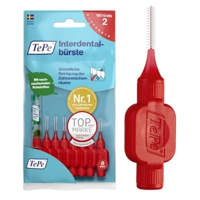Dental care and cleaning. Interdental brush. 8 interdental brushes and a protective case per pack. The cap can be used to protect the brush and to extend the handle.