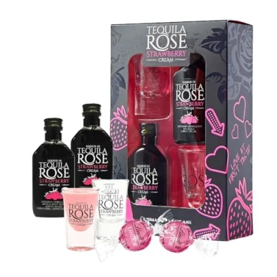 Celebrate special moments with our Strawberry Tequila Rose Gift Set with Lindt Chocolate Truffles, the perfect gifts for couples. This beautifully curated gift box includes everything needed for an unforgettable experience, making it an ideal gift for women and men who appreciate quality and elegance. Great for Couple Gifts: share the joy of exceptional creamy liqueur moments with your loved one. This gift set is designed for couples who appreciate the finer things in life. Tequila Rose alcohol gift set includes: 2 x 5cl strawberry cream liqueur, 2 x Branded Shot Glasses and 2 Lindor's Strawberry Cream chocolate truffles. Presented in an elegant box, this cream liqueur lovers gift set is not only a treat for the taste buds but also a delight for the eye. Tequila Rose is the original strawberry cream liqueur - a silky smooth pairing of rich strawberry cream and the thrilling bite of tequila, was a bold innovation, the first drink of its kind to pair cream with anything other than whiskey. Exotic. Unexpected. Delicious. Tequila Rose is perfect served chilled. Delicious over ice, Tequila Rose Strawberry Cream liqueur also works brilliantly as a mixer and as a base for cocktails. Whether you're planning a romantic night in or looking to surprise someone special, the Tequila Rose Gift Set is the perfect way to add a touch of sweetness to the occasion. Make this Christmas festive season memorable with the Tequila Rose Gift Set. Order now and treat your loved ones to a delightful blend of sophistication and flavour! Cheers to festive moments and shared joy!