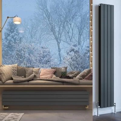 Forte is a flat bar range of designer radiators available in both single or double panel variants; each bar is 70mm wide with a small gap which creates a very seamless looking design set against the wall. This Forte double panel (V20) model is manufactured from a double layer of flat steel profiles mounted on round rear collectors, with a very shallow projection of just 93mm including fixings. Note: Terma also offer a Forte single panel model (V10) which has a lower projection of 73mm. The metallic grey (aka Anthracite) colour from Terma has a matt, rough texture. The Forte range have the unique feature that they can be installed either... vertically with the bars running up and down (valves connected on the sides)... or they can be installed horizontally with the bars running left to right (valves connected on the undersides). The same physical model you buy can be installed either way up giving maximum flexibility dependant on your space requirements. As you rotate rad it changes the side view of the brackets; bars running vertically the brackets are on show, but with the bars running horizontally the brackets are fully concealed. Forte is pre fitted with an internal diverter (baffle) which is an aid to ensure even heat distribution. If being installed with the bars running vertically this should be left in place. If this is installed with the bars running horizontally this need to be tapped out.