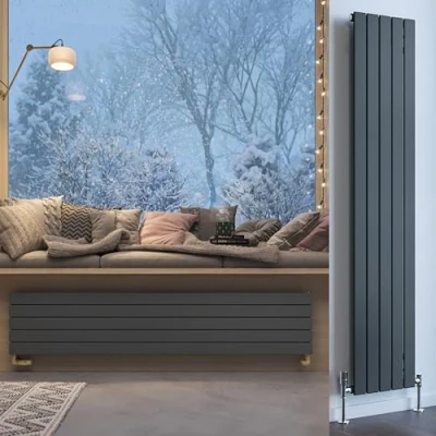Forte is a flat bar range of designer radiators available in both single or double panel variants; each bar is 70mm wide with a small gap which creates a very seamless looking design set against the wall. The Forte single panel (V10) model is manufactured from a single layer of flat steel profiles mounted on round rear collectors, with a very shallow projection of just 73 mm including fixings. Note: Terma also offer a Forte double panel (V20) model which has a deeper projection of 93mm. The metallic grey (aka Anthracite) colour from Terma has a matt, rough texture. The Forte range have the unique feature that they can be installed either... vertically with the bars running up and down (valves connected on the sides)... or they can be installed horizontally with the bars running left to right (valves connected on the undersides). The same physical model you buy can be installed either way up giving maximum flexibility dependant on your space requirements. As you rotate rad it changes the side view of the brackets; bars running vertically the brackets are on show, but with the bars running horizontally the brackets are fully concealed. Forte is pre fitted with an internal diverter (baffle) which is an aid to ensure even heat distribution. If being installed with the bars running vertically this should be left in place. If this is installed with the bars running horizontally this need to be tapped out.