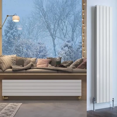 Forte is a flat bar range of designer radiators available in both single or double panel variants; each bar is 70mm wide with a small gap which creates a very seamless looking design set against the wall. This Forte double panel (V20) model is manufactured from a double layer of flat steel profiles mounted on round rear collectors, with a very shallow projection of just 93mm including fixings. Note: Terma also offer a Forte single panel model (V10) which has a lower projection of 73mm. This white (RAL 9016) colour has a silk, smooth texture. The Forte range have the unique feature that they can be installed either... vertically with the bars running up and down (valves connected on the sides)... or they can be installed horizontally with the bars running left to right (valves connected on the undersides). The same physical model you buy can be installed either way up giving maximum flexibility dependant on your space requirements. As you rotate rad it changes the side view of the brackets; bars running vertically the brackets are on show, but with the bars running horizontally the brackets are fully concealed. Forte is pre fitted with an internal diverter (baffle) which is an aid to ensure even heat distribution. If being installed with the bars running vertically this should be left in place. If this is installed with the bars running horizontally this need to be tapped out.