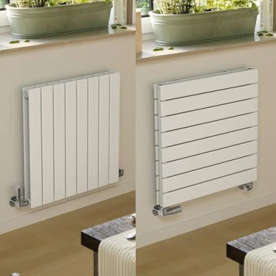Forte is a flat bar range of designer radiators available in both single or double panel variants; each bar is 70mm wide with a small gap which creates a very seamless looking design set against the wall. This Forte double panel (V20) model is manufactured from a double layer of flat steel profiles mounted on round rear collectors, with a very shallow projection of just 93mm including fixings. Note: Terma also offer a Forte single panel model (V10) which has a lower projection of 73mm. This white (RAL 9016) colour has a silk, smooth texture. The Forte range have the unique feature that they can be installed either... vertically with the bars running up and down (valves connected on the sides)... or they can be installed horizontally with the bars running left to right (valves connected on the undersides). The same physical model you buy can be installed either way up giving maximum flexibility dependant on your space requirements. As you rotate rad it changes the side view of the brackets; bars running vertically the brackets are on show, but with the bars running horizontally the brackets are fully concealed. Forte is pre fitted with an internal diverter (baffle) which is an aid to ensure even heat distribution. If being installed with the bars running vertically this should be left in place. If this is installed with the bars running horizontally this need to be tapped out.