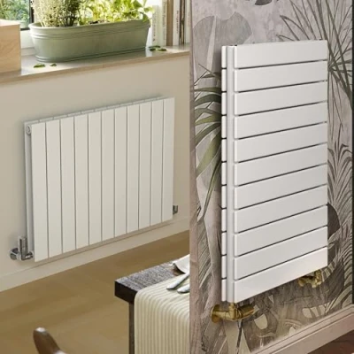 Forte is a flat bar range of designer radiators available in both single or double panel variants; each bar is 70mm wide with a small gap which creates a very seamless looking design set against the wall. This Forte double panel (V20) model is manufactured from a double layer of flat steel profiles mounted on round rear collectors, with a very shallow projection of just 93mm including fixings. Note: Terma also offer a Forte single panel model (V10) which has a lower projection of 73mm. This white (RAL 9016) colour has a silk, smooth texture. The Forte range have the unique feature that they can be installed either... vertically with the bars running up and down (valves connected on the sides)... or they can be installed horizontally with the bars running left to right (valves connected on the undersides). The same physical model you buy can be installed either way up giving maximum flexibility dependant on your space requirements. As you rotate rad it changes the side view of the brackets; bars running vertically the brackets are on show, but with the bars running horizontally the brackets are fully concealed. Forte is pre fitted with an internal diverter (baffle) which is an aid to ensure even heat distribution. If being installed with the bars running vertically this should be left in place. If this is installed with the bars running horizontally this need to be tapped out.