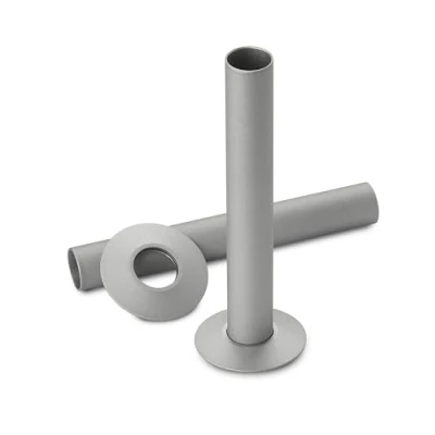 Pipe masking set - to cover the exit point for your valves from the wall and into the back of your radiator. Gives the perfect finish with a collars to sit around the pipes where they come out of the wall and pipes to sleeve your cooper pipes within. Match these with the CYLINDRICAL or TRADITIONAL valves ranges from Terma. Pipes are 130mm in Length, 18mm in diameter (16.5mm internal diameter) so will sleeve over 15, 10 or 8 mm diameter copper pipework. Collars are 44mm Diameter. Matt Grey in colour. Important Note: This listing is for the pipes collars only. The valves pictured are not included. We show these images so you can see how they will look once placed next to the valves. Look for the valves shown in the the image and these need to be beought separately.