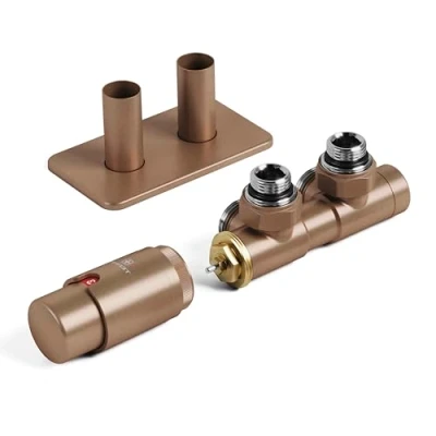 The Twins sets of valves come complete with 50mm connection valves and a 50mm pipe masking set - all produced in the matching colour to your radiator with the same 50mm connections. These valves are specially stocked to pair with any radiator with 50mm connections (i.e. Hex) manufactured in the same colour to achieve an overall matching finish head to toe. Angled orientation and left sided (with the TRV head on the left hand side of the product and the body of the valve on the right side). The Bright Copper colour from Terma has a metallic, smooth texture. Full contents list: 1x valve body (50mm pipe centres), 1x Coloured Plastic/Brass Thermostatic head, 2x Coloured Nut for multilayer pipe adapter, 2x Coloured Nut for copper pipe adapter, 2x Coloured 50mm Pipes, 1x Coloured Steel/Brass Wall Masking Cover with 2 Holes, 2x Brass Nipple, 2x Brass Clamping ring, 2x Brass Copper pipe adapter sealing kit Note: The Vario valves are not bi-directional - therefore you need to select the correct left or right orientation.