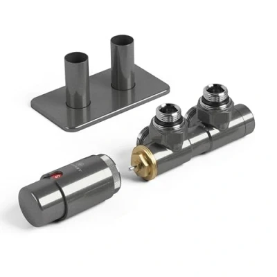 The Twins sets of valves come complete with 50mm connection valves and a 50mm pipe masking set - all produced in the matching colour to your radiator with the same 50mm connections. These valves are specially stocked to pair with any radiator with 50mm connections (i.e. Hex) manufactured in the same colour to achieve an overall matching finish head to toe. Angled orientation and left sided (with the TRV head on the left hand side of the product and the body of the valve on the right side). The Sparkling Grey colour has a silk. smooth finish. Full contents list: 1x valve body (50mm pipe centres), 1x Coloured Plastic/Brass Thermostatic head, 2x Coloured Nut for multilayer pipe adapter, 2x Coloured Nut for copper pipe adapter, 2x Coloured 50mm Pipes, 1x Coloured Steel/Brass Wall Masking Cover with 2 Holes, 2x Brass Nipple, 2x Brass Clamping ring, 2x Brass Copper pipe adapter sealing kit Note: The Vario valves are not bi-directional - therefore you need to select the correct left or right orientation.