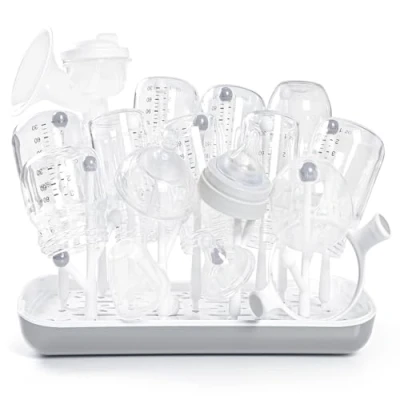 Safe Material: The drying rack for baby bottles is made of food grade materials, nontoxic, free of lead, BPA and more. Stable Base: Baby bottle dryer rack can hold all baby bottles and feeding accessories. Dry all shapes and sizes breastfeeding gear, sippy cups, nipples, pacifiers, pump parts and others. Space Saving: The bottle drying rack keep baby small parts away from water and smaller countertop space. Looks great in kitchen or restroom. Convenient: Removable, reversible drip tray can be set to either catch water or drain into sink.It keeps bottles upright and easy to get the baby accessories you want. Easily Clean: The detachable drip tray is easy to dispose the excess water, you can pull rack out to clean it, which keep your counter dry and avoid bacteria/mold growing.