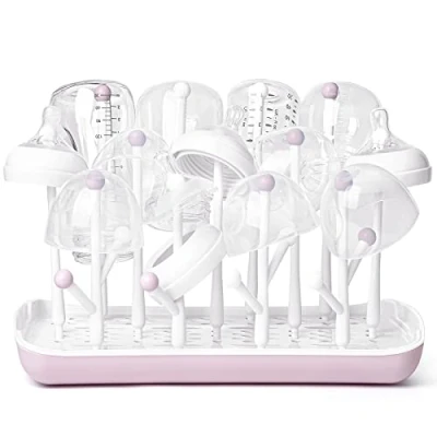 Safe Material: The drying rack for baby bottles is made of food-grade materials, nontoxic, free of lead, BPA and more. Stable Base: The baby bottle drying rack can hold all baby bottles and feeding accessories. Dry all shapes and sizes of breastfeeding gear, sippy cups, nipples, pacifiers, pump parts and others. Space Saving: The bottle dryer rack keeps baby small parts away from water and smaller countertop space. Looks great in the kitchen or restroom. Convenient: Removable, reversible drip tray can be set to either catch water or drain into the sink. It keeps bottles upright and easy to get the baby accessories you want. Easy to assemble, you can install the branch according to your needs. Easily Clean: The detachable drip tray is easy to dispose of excess water, you can pull the rack out to clean it and keep your counter and rack dry.