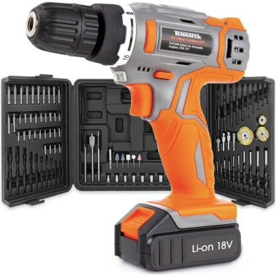 General description The Terratek 89Pc Cordless Drill Driver is a versatile 18V/20V-Max Li-Ion combi drill set, perfect for both novice DIY enthusiasts and experienced craftsmen. It comes complete with a comprehensive 89-piece accessory kit, including a powerful Li-ion battery that eliminates memory effect and self-discharge, ensuring it's always ready for use. The drill features a built-in LED work light for visibility in dark areas and is housed in a convenient carry case for easy transport. Technical specifications Voltage: 18V/20V-Max No load speed: 650rpm Torque settings: 16 Chuck size: 0.8 - 10mm keyless chuck Weight: 1kg Battery charging time: 3 - 5 hours Compatibility and accessories Includes 12 x 50mm screwdriver bits Includes 22 x 25mm screwdriver bits Includes 10 x wood drill bits Includes 10 x steel drill bits Includes 10 x HSS drill bits Includes 9 sockets (5mm – 13mm) Includes 3 x wood spade drill bits Includes 1 x magnetic bit holder Includes 1 x adaptor for sockets
