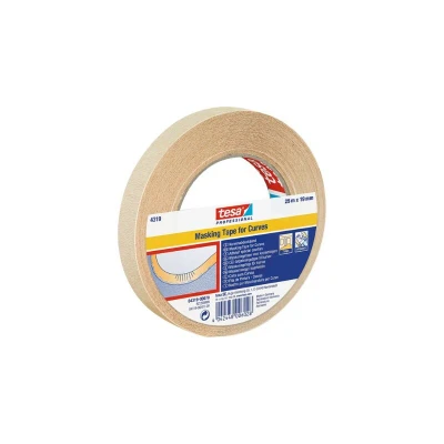 General description The Tesa Professional Masking Tape for Curves is a premium flexible masking tape designed specifically for masking off curves. Its high-quality crepe material allows it to adapt perfectly to any curvature, ensuring a precise and clean finish. The thick adhesive padding provides reliable adhesion, even on rough surfaces. Technical specifications Width: 19 mm Length: 25 m