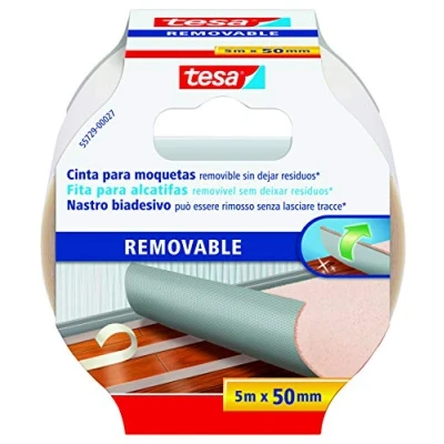 tesa Double-sided floor adhesive for residue-free removal of carpets, PVC covers and other sensitive surfaces, can be removed without leaving any residue Secure and instant adhesion: the tape is reinforced with fabric on both sides to ensure strong attachment; can be torn off by hand to get the desired length Innovative scraper technology – the carpet tape can be glued quickly, safely and crease-free thanks to textile reinforcement – the surface can be applied immediately after use Solvent-free and odourless: the reliable carpet can be removed at any time without leaving any residue on the surface Includes 1 x Double Sided Tape Residue-free removal: 5m x 50mm Not suitable for natural stone floors, Weight: 0.12 pounds, Manufacturer: tesa