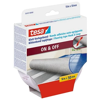 Velcro tape for attaching carpets and carpets: one side adhesive, the other side with hook button technology - suitable for hard, solid surfaces Easy to use: the carpet laying tape is easy to cut by hand - the adhesive side is attached to the floor, the Velcro side fixes carpets or carpets safely and reliably Comfortable Velcro fastening: with the help of hook button technology, carpets and carpets with fleece or felt backing are easily fixed - suitable for wet rooms or rooms with underfloor heating Carpet tape can be easily removed: with the Velcro strip, worn carpets can be replaced at any time Box contents: 1 x tesa Velcro installation tape on and off for attaching floors - can be cut to the desired length - 10 m x 50 mm, Manufacturer: tesa