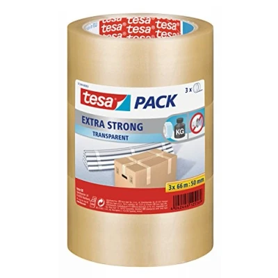 tesapack Extra Strong: extra strong, clear packing tape in robust PVC quality for secure packaging of heavy cartons, padded envelopes and cartons Robust and reliable: due to its high tear resistance and special adhesive strength, this parcel tape proves its remarkable stability even with heavier objects Low-noise unwinding: in contrast to other adhesive tapes, tesa's packing tape roll is quiet and comes out evenly when unrolled, enabling a quiet work environment Our tip: this packaging tape is particularly easy to use with the practical tape dispensers from tesa Scope of delivery: 3 x tesapack Extra Strong, 66m x 50mm, Clear, Weight: 1.46386941968 pounds, Manufacturer: Tesa