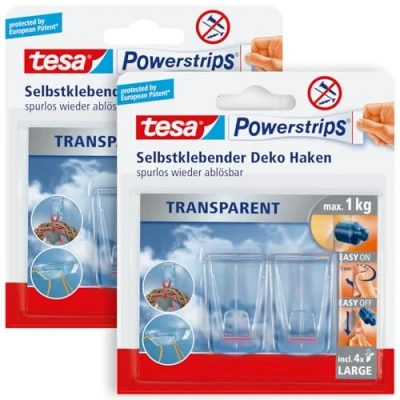tesa Adhesive Hooks for Glass: the innovative and smart choice for attaching decorative items, hanging plants or frames to windows or glass facades These clear strip hooks help make better use of transparent and glass surfaces, where drilling or using nails would be difficult - the hooks reliably hold objects up to 1 kg For maximum adhesive strength, simply attach the hook with the tesa Powerstrips - the adhesive hooks can be removed without leaving any residue and can be easily reused with new adhesive strips Application: clean the surface to be covered with alcohol or silicone free window cleaner - apply the Powerstrip and attach the hook - the surface is decorated quickly and safely, Manufacturer: tesa