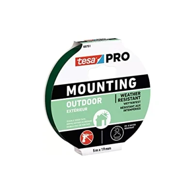 DOUBLE FACE MOUNTING PRO EXTERIOR TAPE 1.5 m x 19 mm. TESA MOUNTING PRO EXTERIORTESA MOUNTING PRO EXTERIOR MAKES PROFESSIONALS OUTDOOR APPLICATION WORKS FASTER AND EASIER. The tape adheres to particularly complicated surfaces. LIKE TILES. BRICKS. METAL AND HARD PLASTIC CONITS STRONG AND RELIABLE ADHESION POWER GET DURABLE ADHESIONS AND ENSURE THE ESSENTIAL OUTDOOR ELEMENTS FOR YOUR CUSTOMERS. AS MAILBOXES OR HOUSE NUMBERS. WITH THIS UV RESISTANT TAPE WATER AND TEMPERATURE.
