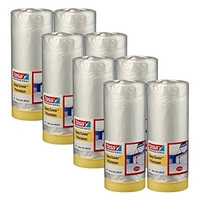 Time-saving: the 2-in-1 solution for painters - transparent HDPE masking film combined with the tesa precision masking tape 4334 PLUS - for large-area protection and high-quality work results in one step Precision: optimal results when painting, painting and renovation - the masking tape allows sharp, flat paint edges - suitable for smooth and slightly textured surfaces No drips: the embossing of the masking film prevents the paint from running down on the surfaces to be protected - thus prevents damage caused by paint drops on walls, furniture or floors - for clean results Indoor and outdoor: the painter's cover film is both UV-resistant and easy to remove indoors for over 6 months and over 2 months outdoors Box contents: 8 x tesa Easy Cover 4365 precision, with integrated tesa precision crepe 4334 Plus – resistant to all paints and varnishes – suitable for airless applications, ideal for professional use