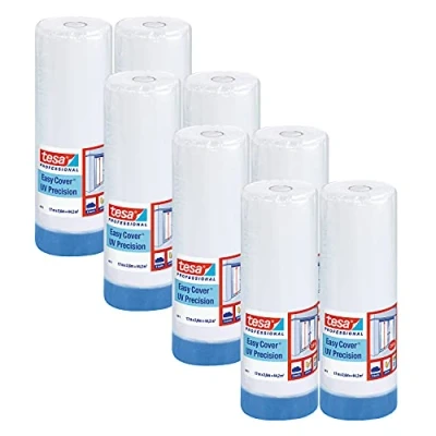 Time-saving: the 2-in-1 solution for painters - supple masking film combined with the Tesa precision masking 4440 UV Plus - for large protection and good work results in one step Precision: precise results when painting and varnishing - the masking tape allows sharp, flat paint edges and is suitable for smooth and slightly textured surfaces No drops: the embossing of the masking film prevents the paint from falling off on the surfaces to be protected, thus prevents damage caused by paint drops Outdoor: the painter's masking film is UV-resistant for over 6 months and therefore ideal for outdoor use – especially suitable for multiple tasks – sticks to glass, aluminium and wood Box contents: 8 x tesa Easy Cover 4411 UV precision, white-transparent HDPE painter's masking film with integrated tesa precision masking tape 4440 UV Plus, ideal for professional use