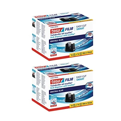 The tesa Easy Cut Smart dispenser is the compact and lightweight dispenser with non-slip base and particularly sharp wave knife for tape up to a size of 10 m x 15 mm The tape dispenser from tesa impresses with the tesa Stop Pad, which ensures a particularly secure stand on the craft or desk despite the low weight of the tesa dispenser The space-saving and practical tesa adhesive film dispenser can be repositioned without leaving any residue and the adhesive force of the tesa Stop Pad can be reactivated several times and easily by cleaning with water Thanks to the non-slip base, the robust holder for the adhesive film and the sharp tear-off edge, the tesa tape roller allows easy gluing - even with one hand Box contents: 2 x tesa Easy Cut Smart dispensers including a roll of crystal clear tesa film, 10 m x 15 mm, housing: black, made from 100% recycled plastic, dimensions: 9.7 cm x 8.2 cm x 6.7 cm
