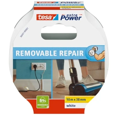 Strong adhesion: Reliable repairs and secure fixing thanks to powerful adhesive – suitable for temporary and permanent use Water-resistant & hand-tearable: Works even in damp conditions, easy to tear by hand and can be labelled Versatile application: Ideal for home, office, events, cable management, decoration and quick repairs Residue-free removal: No sticky residue or surface damage – perfect for renters and temporary solutions Scope of Delivery: 1 roll tesa extra Power Removal Repair, size: 10m x 38mm, colour: White, Weight: 0.2 Pounds, Manufacturer: tesa