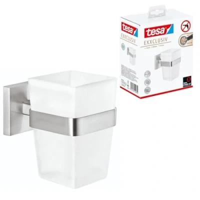 Waterproof bathroom accessory with secure hold: Durable frosted glass shelf with extra-strong adhesive solution for long-lasting hold - convenient storage for all kinds of bathroom utensils Elegant design for stylish bathrooms: The smoothed, angular design with a rounded, square wall plate combined with the cool stainless-steel look creates a modern ambience in every bathroom Easy installation without drilling: Effortless and drill-free mounting of the toothbrush holder without damaging walls and tiles thanks to patented tesa Power.Kit fastening technology Reusable despite high adhesive performance: With a BK20 mounting adapter, the tumbler holder can be removed and reattached without leaving any traces - the matching adapter is available separately, Weight: 1.2566348934 Pounds, Manufacturer: tesa