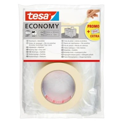 tesa Masking Tape ECONOMY EcoLogo: holds securely and does not slip, thus ensuring cleanliness during painting work - can also be used as adhesive tape, e.g. for bundling objects Reliable protection: the framing tape offers reliable protection against paint drops and splashes even in corners and on edges - it always has good adhesive properties on almost all surfaces Does not leave any residue: the flat-crepe tape can easily be removed up to 4 days after use without leaving behind any sticky excess - saves the annoying task of scraping residue and protects the interior Environmentally friendly and sustainable: solvent-free and made from 55% renewable raw materials, the adhesive tape does without unnecessary additives or chemicals Scope of delivery: 2 x tesa Masking Tape ECONOMY EcoLogo, narrow, 50 m x 30 mm + drop cloth, Weight: 0.88 Pounds, Manufacturer: tesa