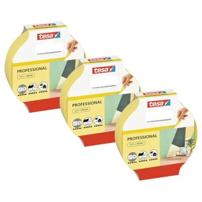 For particularly high precision when painting: Colour edges are even more precise with the extra thin masking tape - for exact results like a professional - without any paint underneath. Reliable protection against paint splashes: Fine masking tape with high adhesive strength, especially suitable for all smooth surfaces throughout the interior. Can be removed without residue for up to 5 months. No annoying removal of adhesive residues, no unsightly marks or damage to the surface. Environmentally-friendly and sustainable: Solvent-free and predominantly made from renewable raw materials. Fabric tape in an advantageous multi-pack with three rolls: 3 x tesa professional painting tape indoors, each 25 m x 25 mm – ideal as a supply for planning demanding projects – suitable for all paint types., Manufacturer: tesa