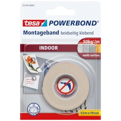 The ideal mounting tape for indoors: Perfect for permanently fixing pictures, key boxes or pin boards to tiles, plaster, wood & many plastics Flexible adaptation: The tape partially adapts to the surface and compensates for minor unevenness, the initially low adhesive force enables easy positioning Permanent and secure hold without screws or nails: ultra-strong adhesive on both sides, develops full adhesive strength when the entire adhesive surface is pressed firmly for 5 seconds High adhesive strength: With a load-bearing capacity of 5 kg per 10 cm, even heavier objects (up to 10 mm deep) can be attached - can be cut to length as required tesa Powerbond INDOOR: Dimensions: 1.5 m x 19 mm - Colour: White - To achieve full holding power, the object and surface must be free of dust, dirt and grease, Weight: 0.04 pounds, Manufacturer: tesa