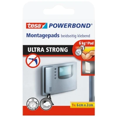 The strongest mounting adhesive pads in the tesa Powerbond range: With a holding force of up to 6 kg per pad Versatile use indoors and in protected outdoor areas: Adheres to tiles, wood, stone and metal, the initially low adhesive strength enables easy positioning Permanent and secure hold without screws or nails: ultra-strong adhesive on both sides, develops full adhesive strength when the entire adhesive surface is pressed firmly for 5 seconds No damage to the wall due to drilling: With a load capacity of 6 kg per pad, even solid objects can be attached Scope of delivery: 1 x 9 Powerbond adhesive pads from tesa - Double-sided adhesive tape for attaching objects to various materials - Dimensions: 6cm x 2cm, Manufacturer: tesa
