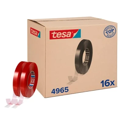 Résistant à de fortes températures et aux UV : Ruban de montage résistant aux agents plastifiants, avec excellente adhésion à divers plastiques tels que l'ABS et l'EPDM - Homologué UL sous MH/18055 Ruban adhésif transparent en PET avec masse adhésive acrylique : Convient à de nombreuses applications, pour l'étanchéité des tuyaux isolants ou le collage de moulures dans l'industrie du meuble L'outil indispensable de l'industrie automobile : Pour l'assemblage de pièces en ABS, pour le collage de capotes de cabriolets et pour le montage de profilés en caoutchouc et en EPDM Plus de possibilités d'application : Peut être utilisé pour le montage de profilés en plomb, le collage de feuilles d'aluminium, la réparation d'écrans de téléphones, ou le collage de panneaux Mounting tape in an advantageous multipack with 16 rolls - ideal as a stock for professional use: 16 x tesafix 4965 mounting tape, each 50 m x 15 mm, transparent and covered with red film