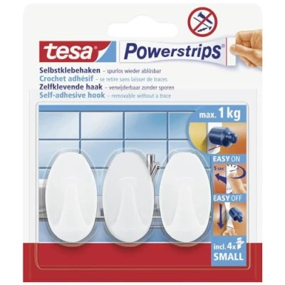 tesa Powerstrips Hooks Small OVAL: ideal for smooth surfaces - with the innovative mounting solution, objects such as pictures, ornaments, bathroom or kitchen utensils can be securely hung on the wall Secure plastic hooks for hanging objects: the self-adhesive hooks allow objects to be hung on the wall without any hammering or drilling and reliably hold up to 1 kg Maximum adhesive strength: simply apply with tesa Powerstrips - these can be removed again without leaving any residue and the hook can be reused with Powerstrips SMALL Application: clean the chosen surface - stick on the double-sided adhesive Powerstrip at the position - attach hook - light objects can be immediately and safely hung up Scope of delivery: 1 tesa Powerstrips Hook Small OVAL, including 3 adhesive hooks with 4 tesa Powerstrips SMALL adhesive tape - Colour: white - Material: plastic, Weight: 0.0440924524 pounds, Manufacturer: tesa