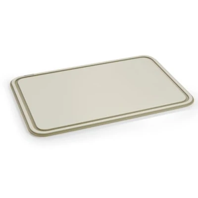 Double-sided chopping board with groove on the top for collecting liquids. Made from durable recyclable plastic. It does not damage the blades and is easy to clean. Dishwasher safe.