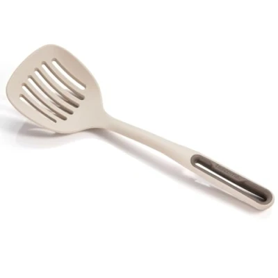 Silicone Kitchen Skimmer Resistant up to 220 °C. Suitable for all types of cookware, including non-stick or ceramic. Dishwasher safe and can be hung up thanks to the hole on the handle. Dimensions: 33 x 10.5 x 4.8 cm