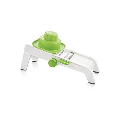 Multi-purpose mandoline with interchangeable blades for slicing ingredients into different shapes Allows you to cut fruits and vegetables quickly and effortlessly into thin, wide strips and straight or wavy slices Adjustable knob, slicing blade on both sides and movable vegetable container with adapter, safety handle and lock Stable structure with folding base and non-slip treatment. Dimensions: length 39 cm - height 15 cm